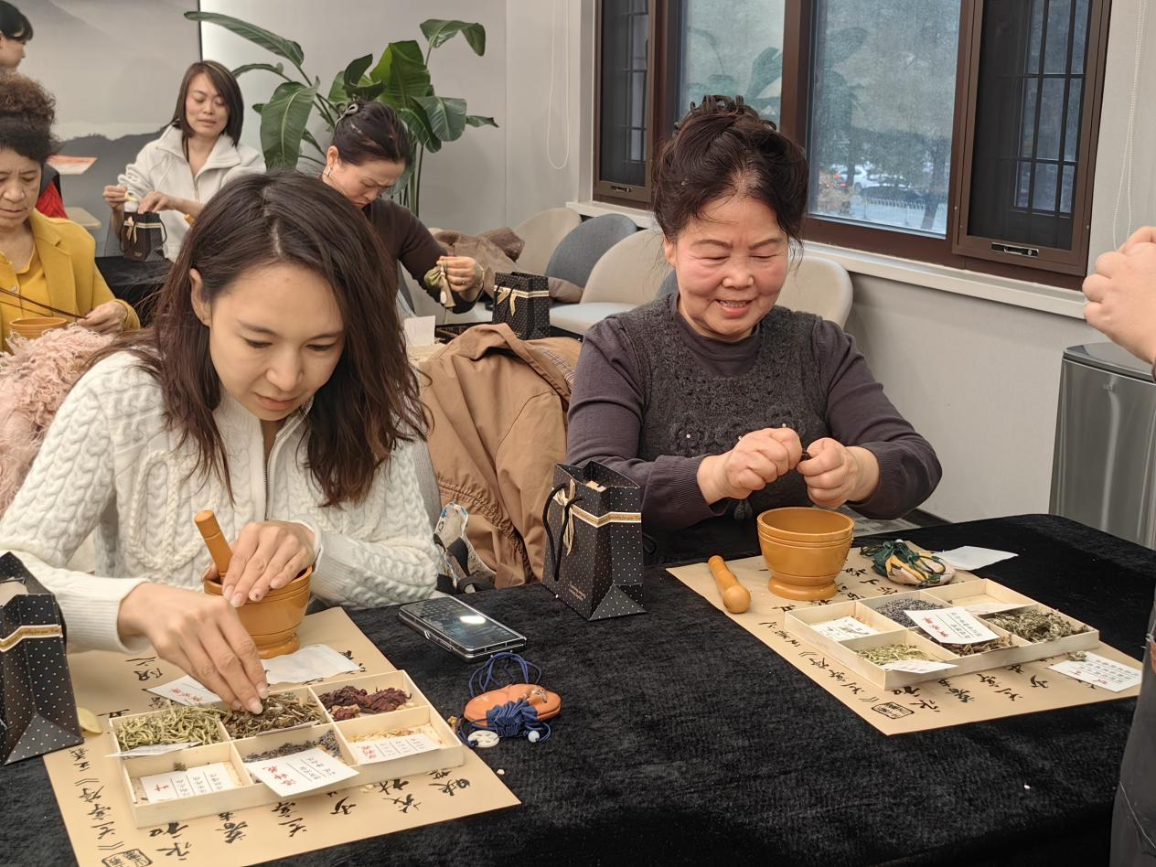 下午2点,辖区浦发银行活动室里,20张桌子上整齐摆放着绸缎包、中药香料和捣碎工具。社区特别邀请老师现场教学,从“填充药芯”到“收口打结”,居民们跟着步骤认真缝制。“重阳节戴香囊是驱邪祈福的老习俗,我们这次选用艾叶、金银花、薰衣草等六味药材,有温经通络、防蚊驱虫的功效。”老师边演示边讲解。