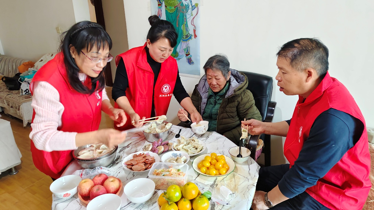 活动现场,志愿者们分工明确、配合默契,原本冷清的屋子瞬间暖意融融。部分志愿者携带清洁工具,细致擦拭家具、全面清扫地面,将老人家中整理得整洁有序;黄玉平与刘建兵先坐在戚奶奶身旁,耐心询问老人身体状况、生活物资需求,关切了解其子治疗进展,轻声宽慰老人并郑重承诺,将持续协助对接医疗资源、及时反馈相关信息。随后,黄玉平走进厨房,挽起衣袖,熟练开展揉面、调馅、包饺子等工作,厨房内欢声笑语不断;刘建兵则携带专业理发工具,发挥自身技能为戚奶奶精心修剪发型,助力老人以清爽精神的面貌迎接重阳节。午餐时段,志愿者们围坐在老人身边,主动为老人夹菜、添汤,陪伴老人共度温馨祥和的时光。“今年重阳节有人陪、能吃上热饭,心里特别暖!”戚奶奶眼眶泛红,多次大家表示感谢。