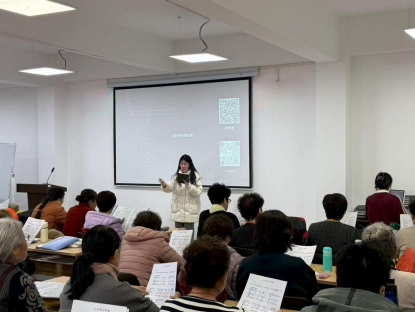 活动中,宁彤老师围绕民族声乐基础理论、科学发声技巧、合唱协作要领及声乐与身心健康等内容进行深入浅出讲解,将艺术知识融入生活理念,带领居民感受声乐文化底蕴与协作之美。实践教学环节,师生以经典红歌、传统民歌、时代金曲为素材,从呼吸练习、发声规范到音准把控、多声部合排,进行细致指导与示范。零基础居民也快速上手,放声歌唱,现场居民精神饱满、热情高涨,在悠扬旋律中放松身心、陶冶情操,进一步拉近了邻里距离。