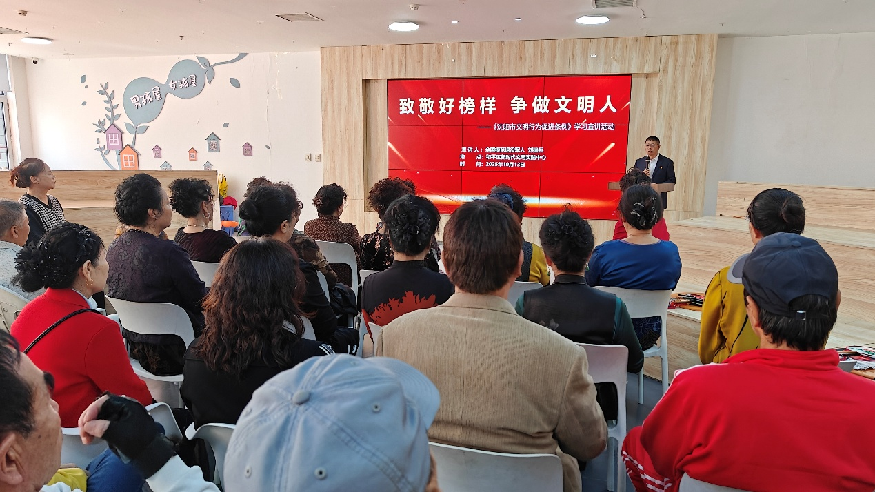为切实将文明理念深度融入辖区居民日常生活,10月13日上午,和平区新时代文明实践中心组织开展“致敬好榜样,争做文明人”《沈阳市文明行为促进条例》学习宣讲活动。活动特别邀请全国模范退役军人刘建兵担任主讲嘉宾,辖区居民、文明实践志愿服务骨干等百余人现场参与,共同学习文明规范,凝聚文明共识。